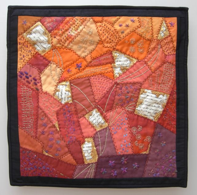 In diesem Quilt werden bruchstückhafte Erinnerungen einer noch nicht abgeschlossenen Vergangenheit in herbstlich warmen Farbtönen widergespiegelt und wie in einem Puzzle zu einem Ganzen zusammengefügt.